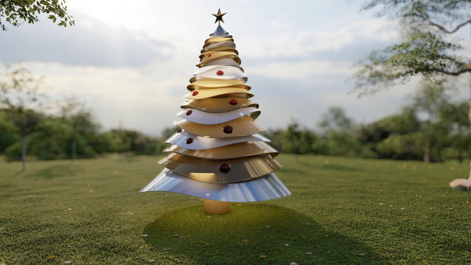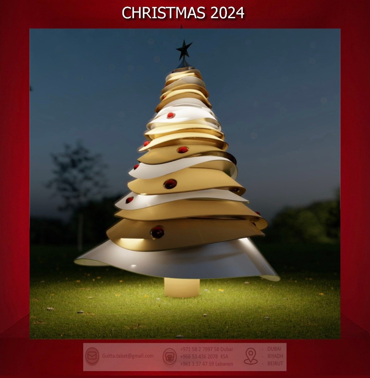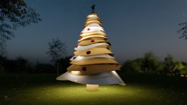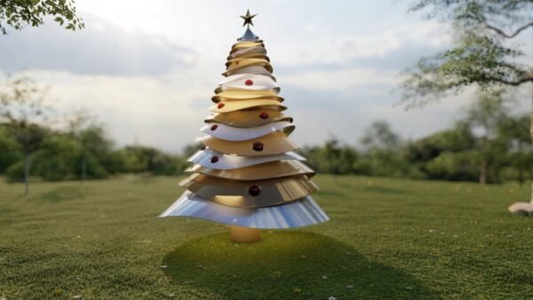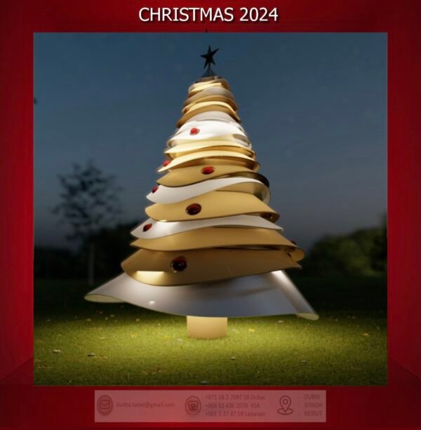 - Celebrate the holidays in style with the exquisite Curved Layers Christmas Tree, finished in Silver & Gold and adorned with rich Burgundy ornaments. This elegant, multi-layered tree design adds depth and sophistication to any room, making it the perfect centerpiece for your festive decor. Crafted with a durable metal finish, it promises lasting beauty and quality. The built-in lighting brings a warm, radiant glow, highlighting the luxurious combination of colors and enhancing the festive ambiance. Whether displayed in your living room, foyer, or office, this tree offers a unique blend of modern elegance and classic holiday cheer.Features: