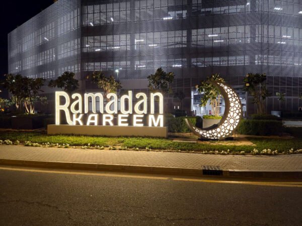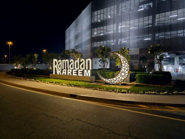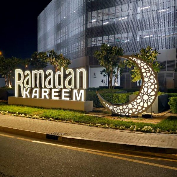 Embrace the spirit of Ramadan with our Illuminated Crescent Moon and “Ramadan Kareem” Sign Installation, designed to bring a festive and welcoming touch to any space. The intricately crafted crescent moon features traditional geometric cut-outs that are illuminated from within, creating a beautiful glow that symbolizes peace and celebration. Paired with the striking “Ramadan Kareem” sign, this installation is perfect for commercial venues, public spaces, and upscale residential exteriors. The modern design, combined with cultural significance, makes it a standout piece for celebrating this special time of the year.